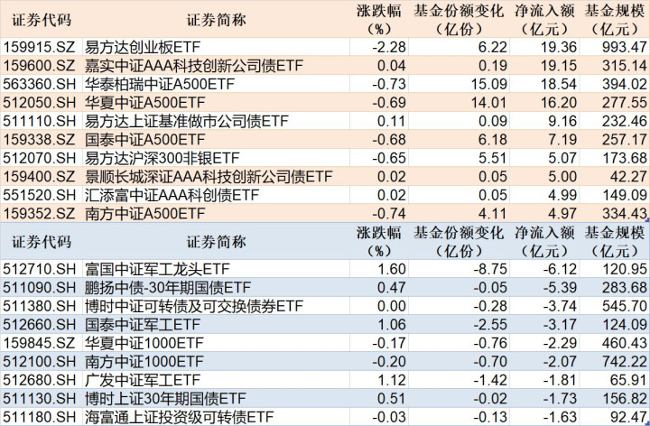 与此同时,富国中证军工龙头ETF基金份额减少8.75亿份,净流出额6.12亿元;鹏扬中债-30年期国债ETF份额减少0.05亿份,净流出额5.39亿元;博时中证可转债及可交换债券ETF份额减少0.28亿份,净流出额3.74亿元。