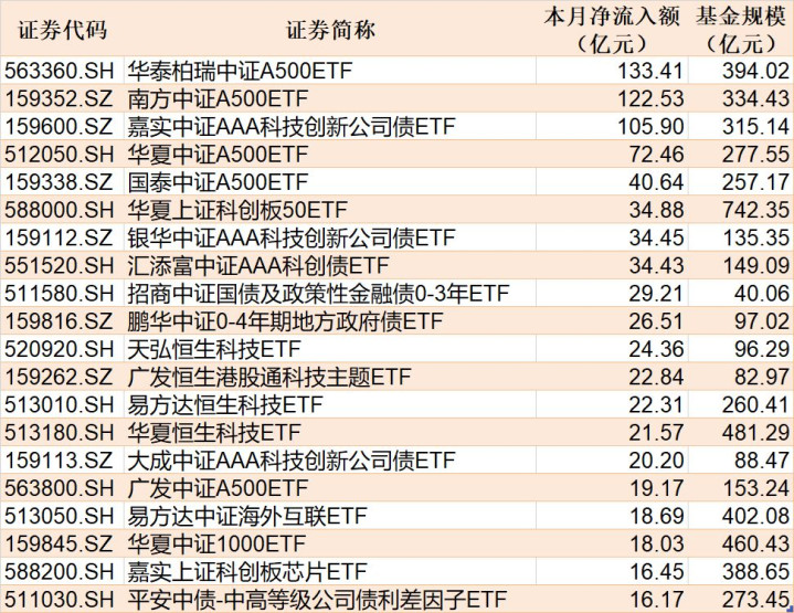 Wind数据显示,在12月18日的非货币ETF市场中,易方达创业板ETF基金份额增加6.22亿份,净流入额19.36亿元;嘉实中证AAA科技创新公司债ETF份额增加0.19亿份,净流入额19.15亿元;华泰柏瑞中证A500ETF份额增加15.09亿份,净流入额18.54亿元。